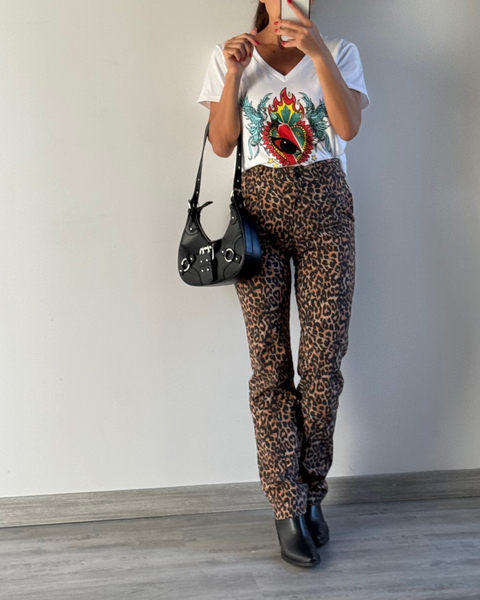 Esta confeccionado en bengalina elastizada animal print, pinzado y con bolsillos laterales.