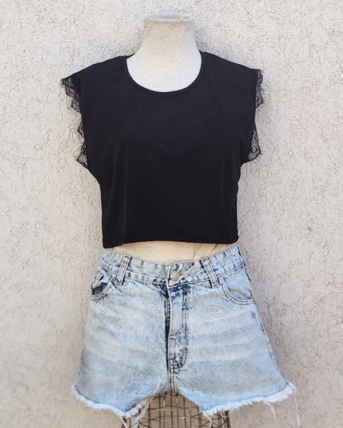 Es una remera basica dde lycra sin mangas con apliques de puntilla en sisa.